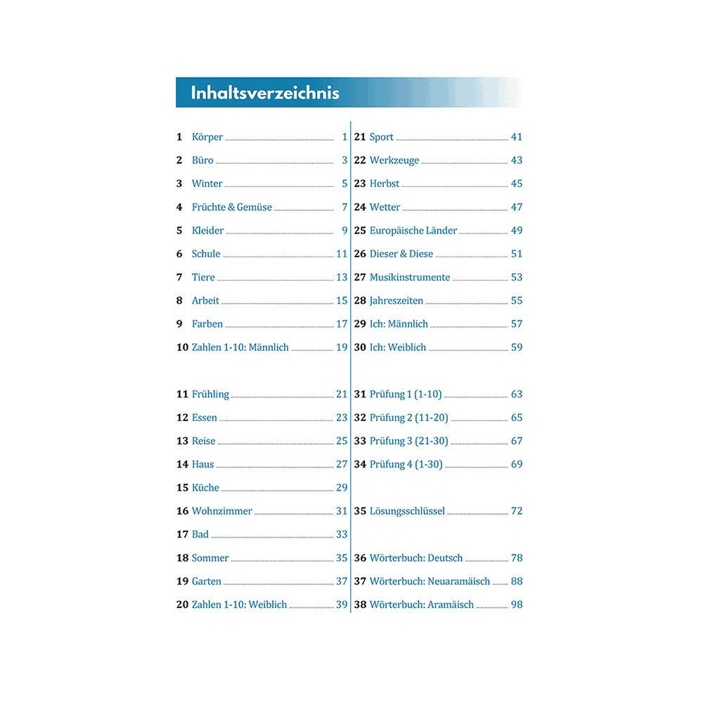 Erweitert den Wortschatz in Neuaramäisch und Syrisch mit 30 Lektionen, Vokabeln, Bildern und 4 Tests. Enthält motivierende Übungen für strukturiertes Lernen, einen Lösungsschlüssel und Wörterbücher in Deutsch, Neuaramäisch und Syrisch. -