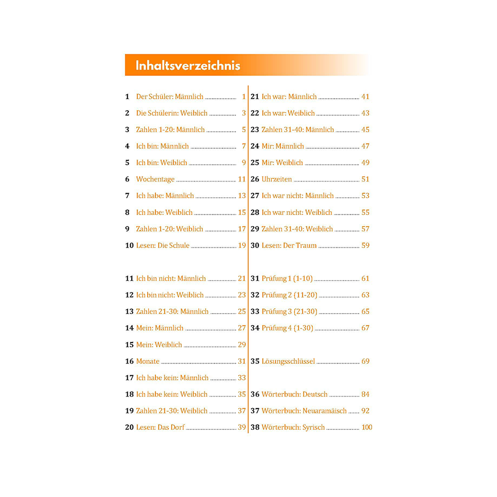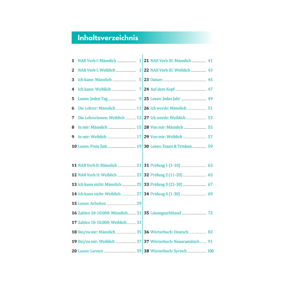 Einführung in die Verbkonjugation für Neuaramäisch und Syrisch. Enthält 30 Lektionen mit zeitgemäßen Übungen, 4 Tests, einen Lösungsschlüssel und Wörterbücher in Deutsch, Neuaramäisch und Syrisch. -