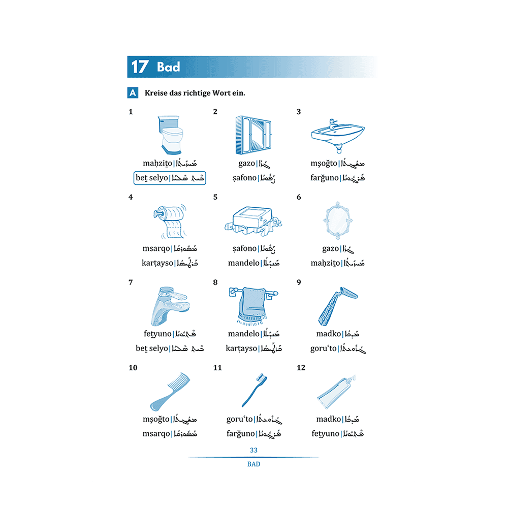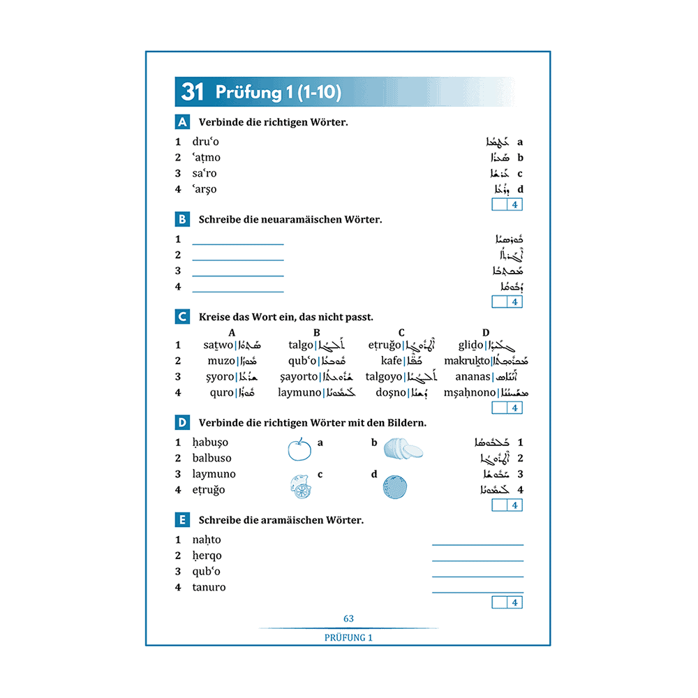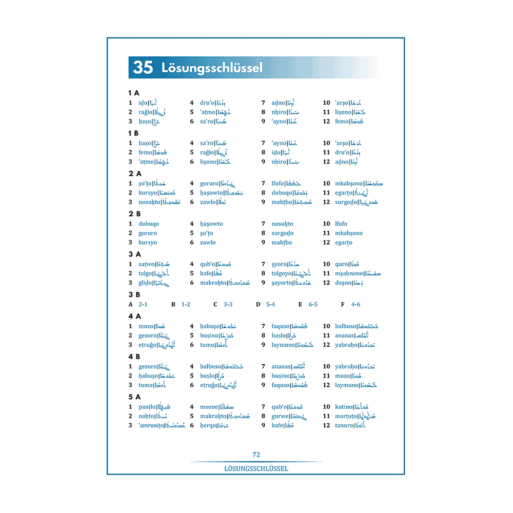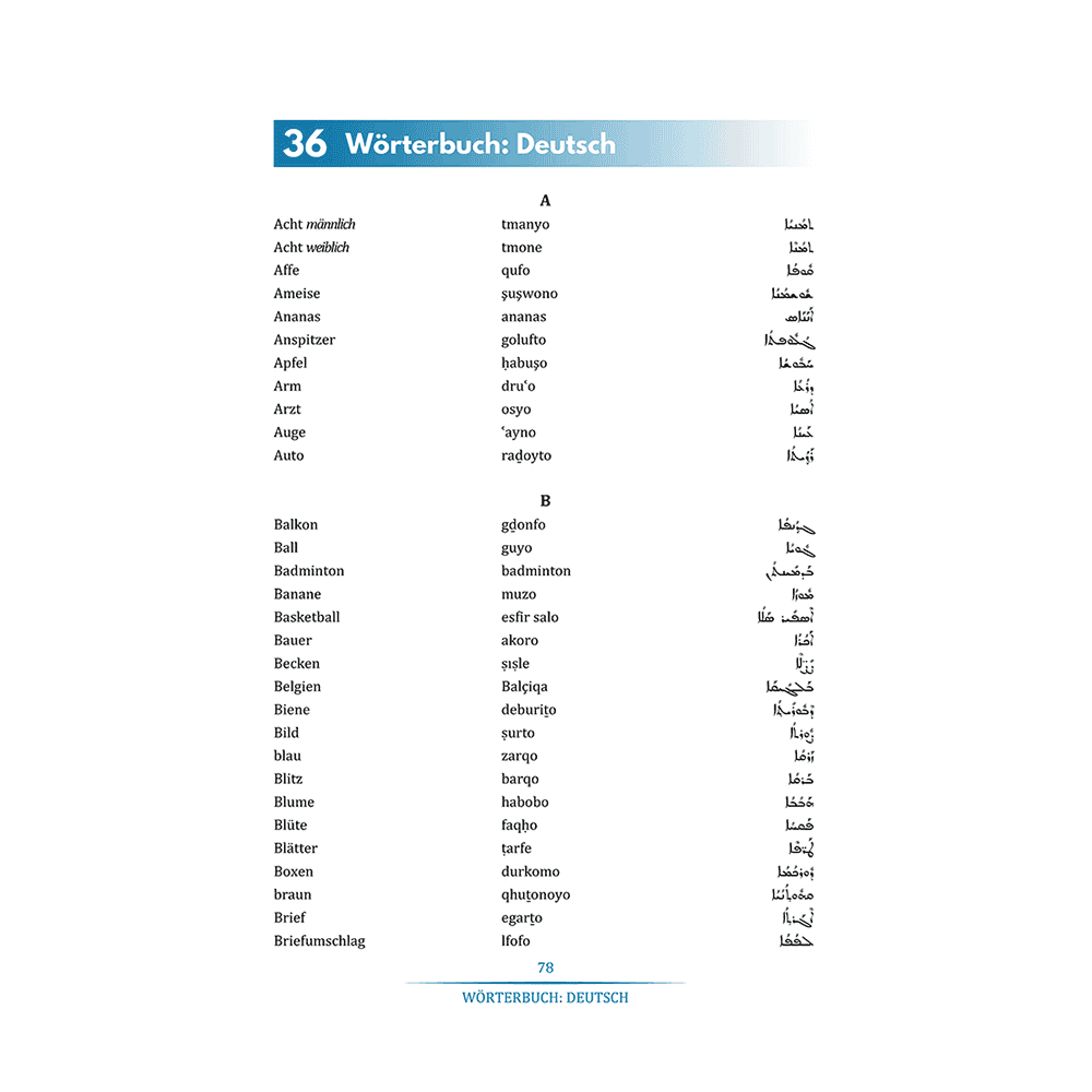 Das Buch enthält außerdem einen Lösungsschlüssel zu den Übungen in einem separaten Kapitel und endet mit Wörterbüchern in Deutsch, Neuaramäisch und Syrisch (Aramäisch).