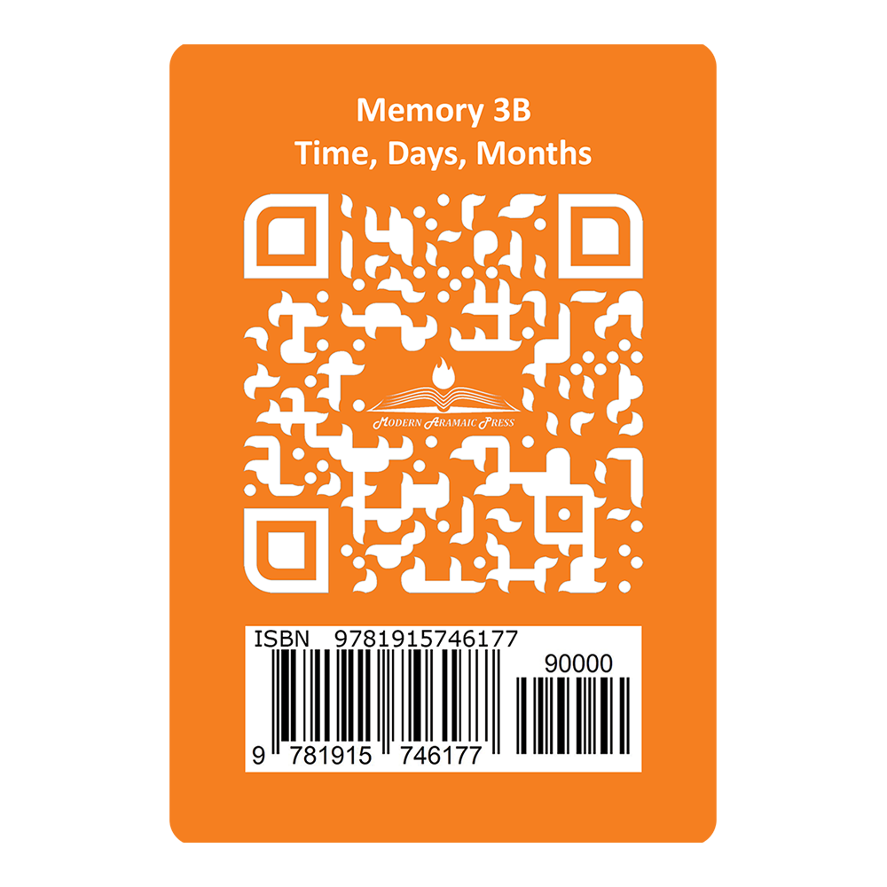 Memory 3B ist ein Kartenspiel mit 55 Karten, die Bilder und Vokabeln zu den Themen Zeit, Tage und Monate enthalten und den Inhalt des Aramäisch-Lehrbuchs 3 widerspiegeln.